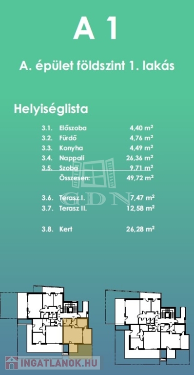 49, 54, 71, 80 nm2 méretű ingatlanok közül lehet választani. Földszinti lakások saját terasszal és kertrésszel míg az 1. és 2. emeleti lakások nagy teraszokkal rendelkeznek.