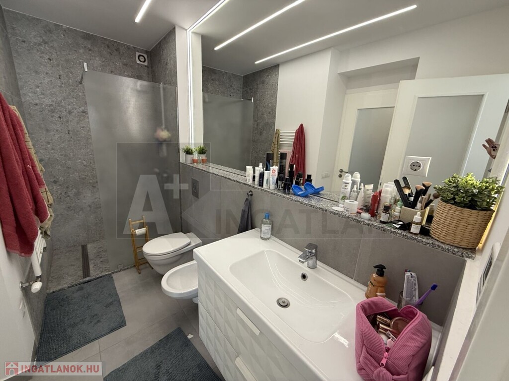 Elrendezését tekintve: a lakás központi része , az amerikai konyhás nappali , magasfényű konyhabútorral , kiváló háztartási gépekkel és a két hálószoba , két fürdőszobával és a napfényes 7m2-es , erkély , mely abszolút ideális a reggeli kv vagy akár az esti vacsora helyszínéül...