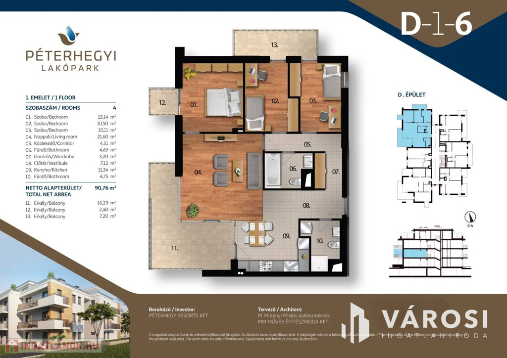 Alapterülete 90,76 m2 + 25,89 m2 erkély.