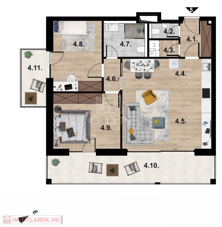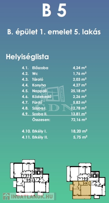 49, 54, 71, 80 nm2 méretű ingatlanok közül lehet választani. Földszinti lakások saját terasszal és kertrésszel míg az 1. és 2. emeleti lakások nagy teraszokkal rendelkeznek.