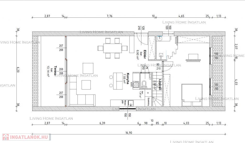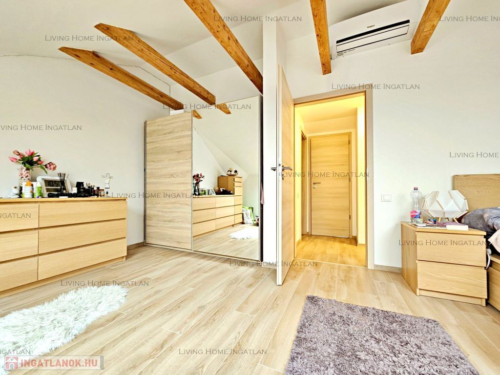 Alsó szint: előszoba, amerikai konyhás nappali, háló, fürdőszoba, külön WC.