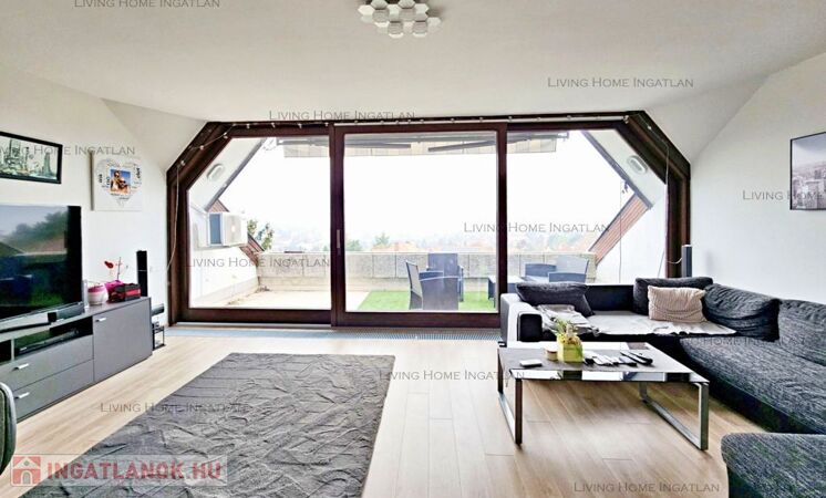Sasad tetején, kertes társasházban kínálunk eladásra egy 94 nm-es, második emeleti, kétszintes, amerikai konyhás nappali + 2 hálós, dupla komfortos, nagy teraszos, tágas lakást pazar panorámával.