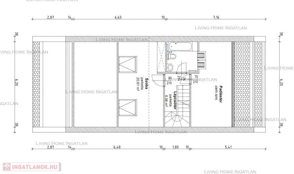Emelet: Nagy hálószoba, fürdőszoba, méretes tároló a padlástérben.