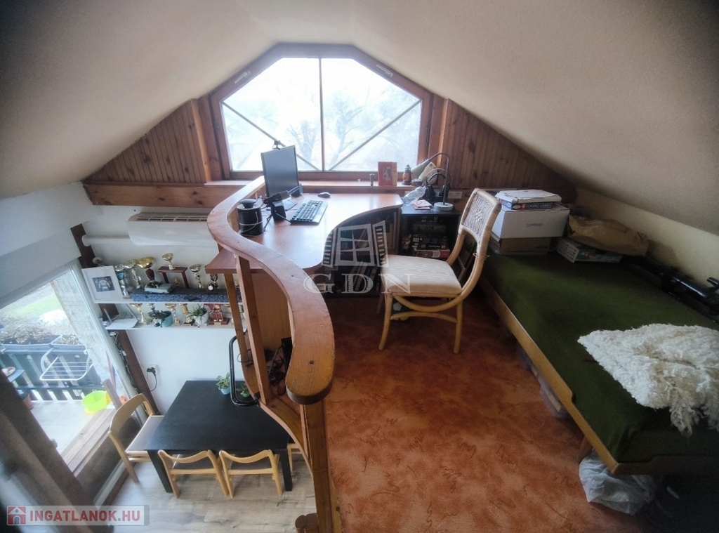 Külön bejárattal is megközelíthető, így önálló lakrészként is használható. Elrendezése: fürdőszoba, két félszoba, valamint egy galériázott nappali konyhával és étkezővel. A panoráma erről a szintről még teljesebb.