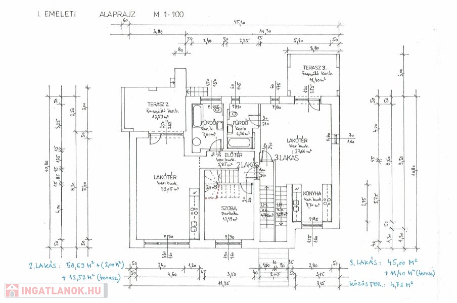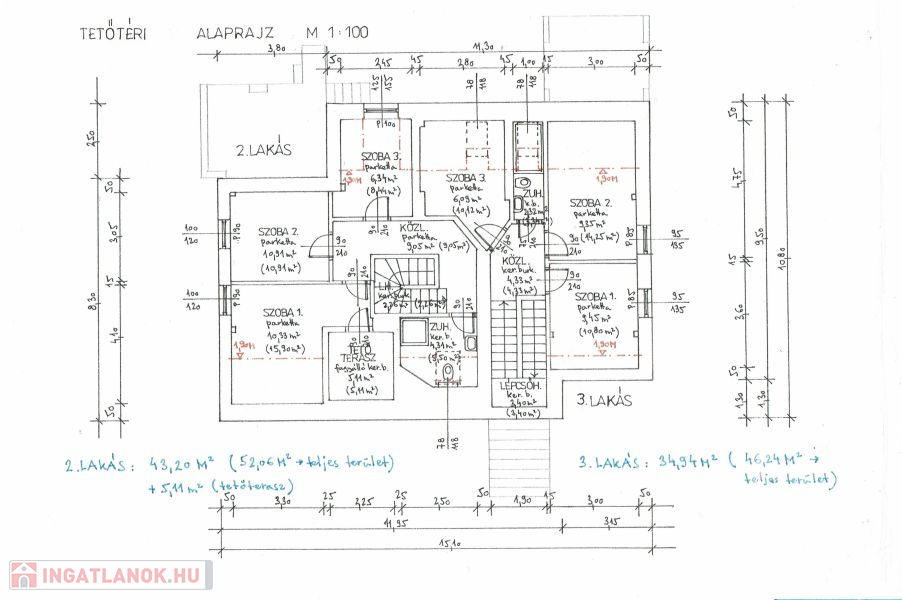 - tetőtér (bruttó 45 nm, nettó 35 nm): előtér, 3 hálószoba, fürdőszoba