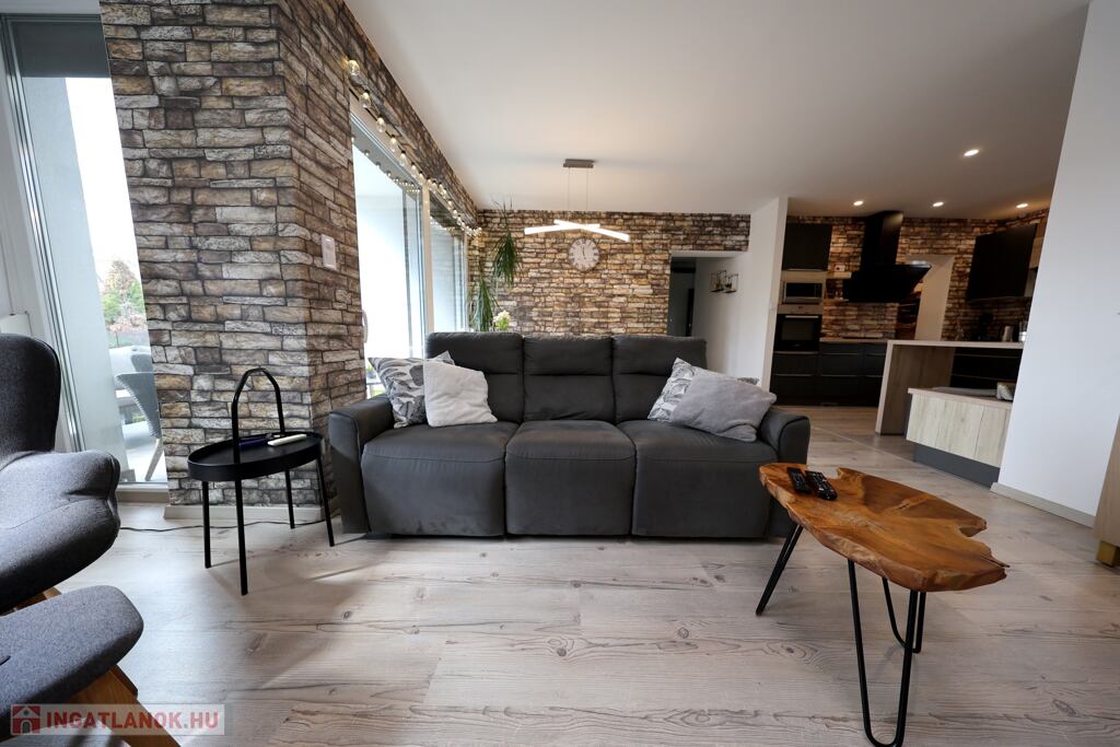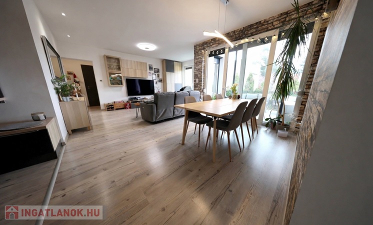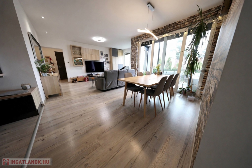 A ház 2019-ben téglából, dryvit szigeteléssel, a telek utcától távoli részében épült. A földszinten garázsok, majd két szinten összesen 4 lakás kapott helyet. Az értékesítésre szánt 1. emeleti (nem zárószinti) lakás átgondolt alaprajzzal rendelkezik, az amerikai konyhás nappali mellett 4 szoba helyezkedik el benne, melyből egy, jelenlegi bútorozása alapján gardróbként funkcionál.