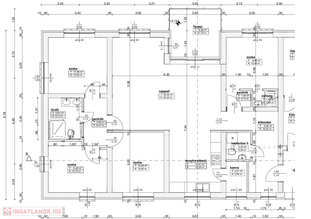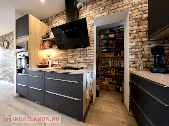 A nappalihoz kapcsolt konyha kamrás, a szekrénysor becsapódás-gátló és fiókfékező technológiával szerelt Kikás bútorzat, háztartási gépeit tekintve Bosch márkával ellátott prémium minőségű kivitelezés jellemzi. A főzést kivezetett szagelszívó és beépített porszívó teszi komfortossá.