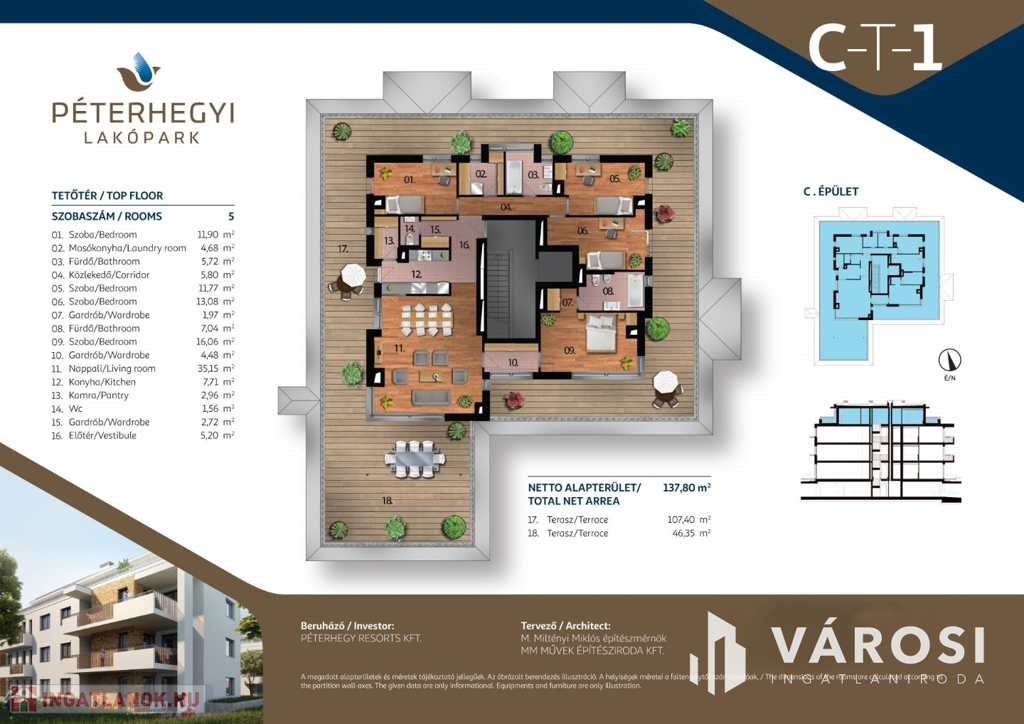 Alapterülete 131 m2 + 158 m2 tetőterasz.