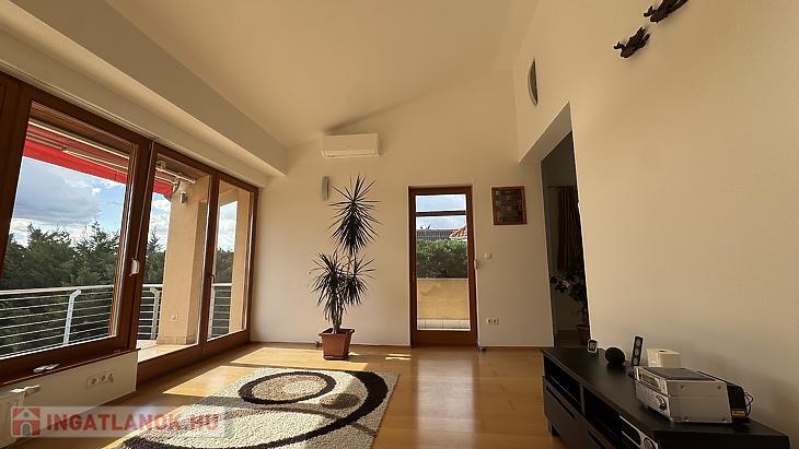 A nappaliból nyílik egy 15 nm-es délnyugati fekvésű, gyönyörű panorámával rendelkező, félig fedett, motoros árnyékolóval ellátott terasz, illetve szintúgy a nappaliból közelíthetjük meg az oldalsó, nyugati fekvésű 5 nm-es, teljesen fedett erkélyt.