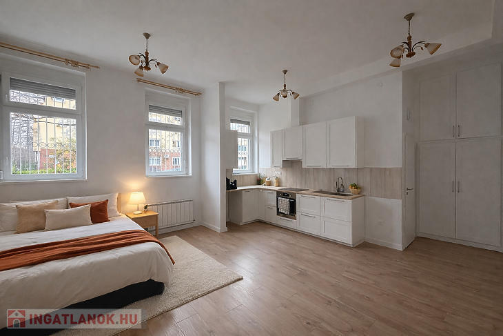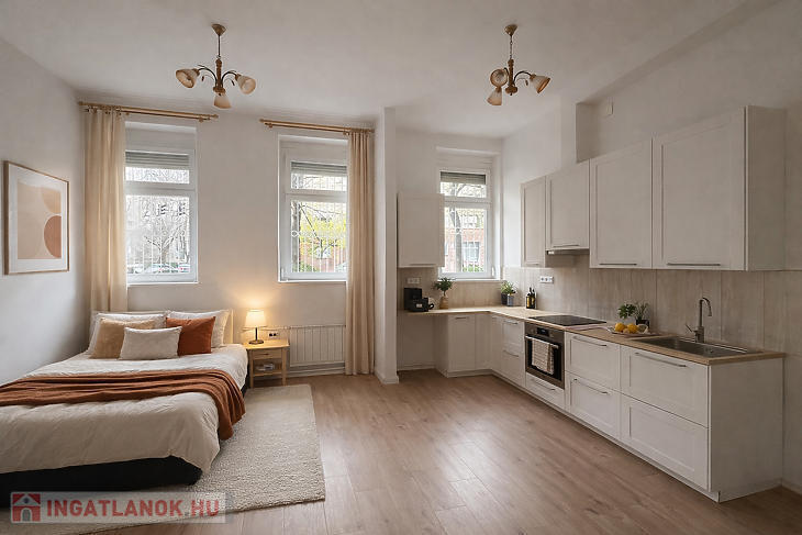 Az ingatlan utcai nézetű, nagy ablakainak köszönhetően rendkívül világos, barátságos hangulatú. A praktikus elrendezés és a letisztult, modern kialakítás kényelmes életteret biztosít, míg az egy légtérben kialakított nappali–konyha megoldás tágas érzetet kelt.