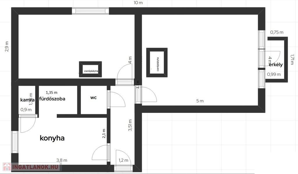 Tágas előszobából, ahol beépített szekrény is található, nyílik 2 különálló szoba, a nagyobb 20 m2, a kisebb pedig 15 m2, az előszobából nyílik a wc is, a konyha 8 m2, ahol kamra is rendelkezésre áll, a konyhából nyílik egy fürdő fülke, ülő káddal, gáz bojlerrel.