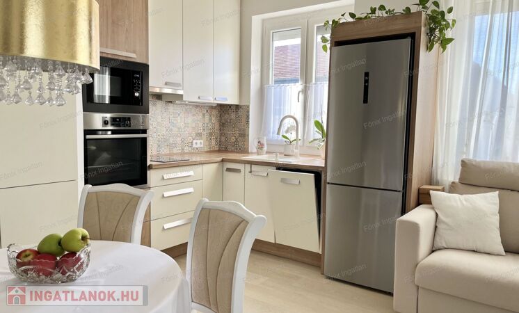 modern gépesített konyhával, ízlésesen berendezett lakás.