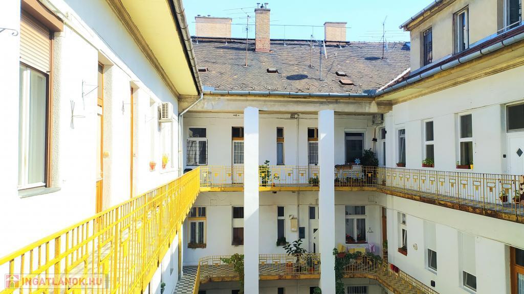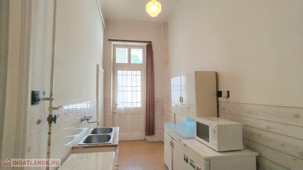 -konyha (11 m2), nyugati fekvésű, belső udvarra néző, a konyhába bejárati ajtó nyílik a függőfolyosóról, így akár 2 kisebb lakássá is alakítható