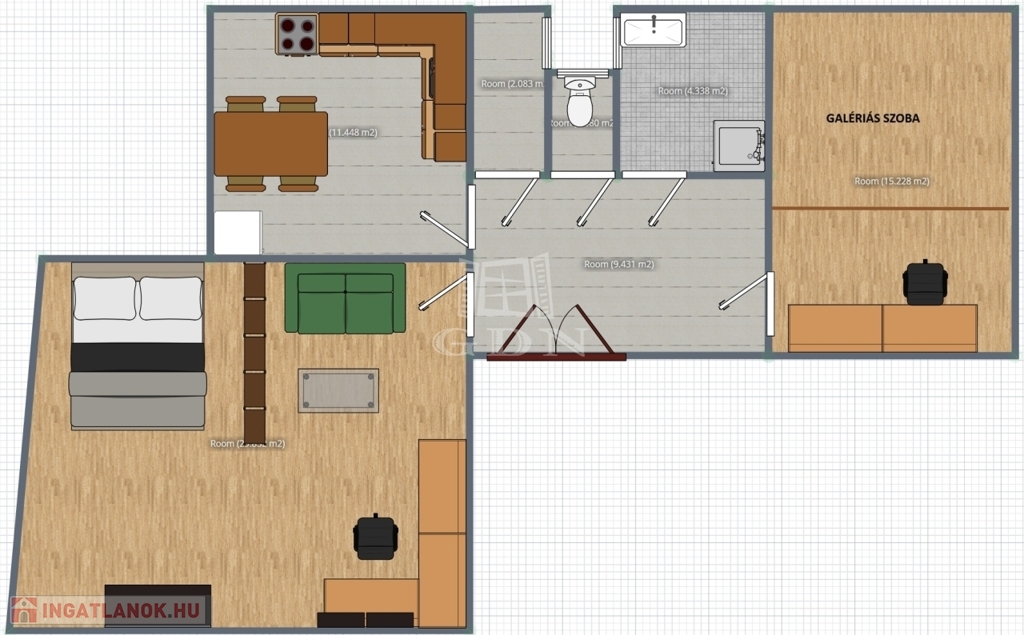 A lakás teljes bútorzattal és gépesítéssel (pl. kanapé, ágy, PAX szekrény, hűtő, mosógép) is megvásárolható. A 3,80 m belmagasság, a galéria (8 m²) és az átgondolt elosztás tágas, praktikus életteret ad.