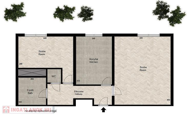 A lakás központi helysége egy 20 nm-es dny-i fekvésű nappali. Szomszédságában találjuk a 9 nm-es ablakos konyhát és az ugyancsak dny-i fekvésű, 11 nm-es, szeparált hálószobát.
