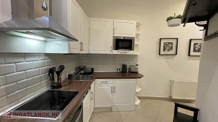 Közvetlen szomszédságában találjuk a teljeskörűen gépesített (sütö, főzőlap, elszívó, mosogatógép, hűtőszekrény, beépített mikro) konyhát.
