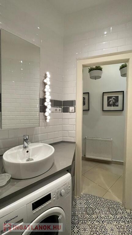 A lakásba lépve egy modern előszobába jutunk. Innen közelíthetjük meg az épített zuhannyal, mosdóval, törölközőszárítóval és mosógéppel szerelt fürdőszobát továbbá a kézmosóval is rendelkező, külön wc-t.
