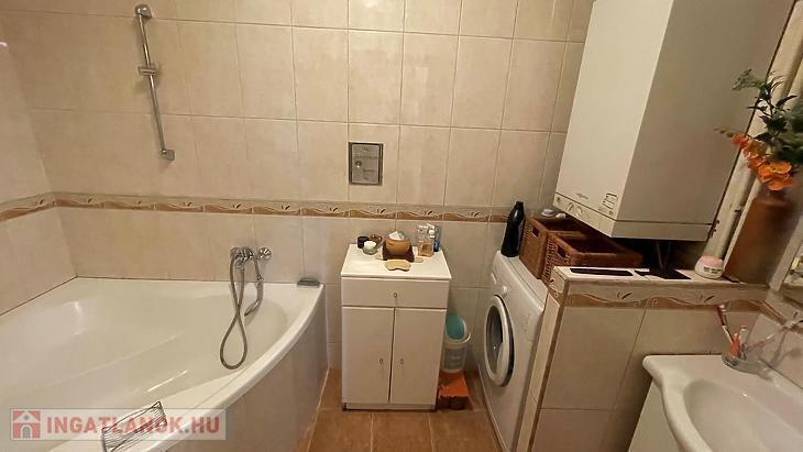 A sarokkáddal szerelt fürdőszobát és a külön wc-t az előszobából közeíthejük meg.