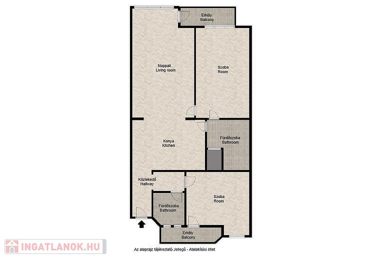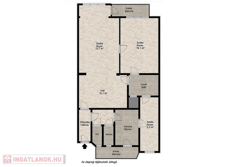 A lakás központi helysége egy 15 nm-es hall, szomszédságában találjuk a 23 nm -es, utcai nézetű, dél-keleti fekvésű, erkélykapcsolatos nappalit, a 18 nm-es hálószobát és a fürdőt.