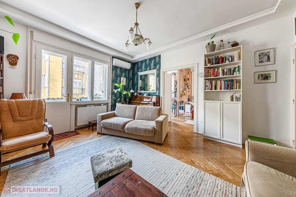 A lakás a második emeleten található, klasszikus elrendezése tágas, jól arányos tereket biztosít.
