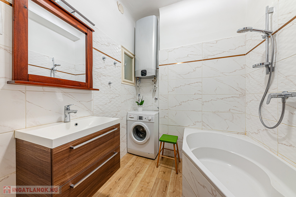 Az ablakos fürdőszobában kényelmes méretű kád, fiókos mosdószekrény és energiatakarékos villanybojler található.