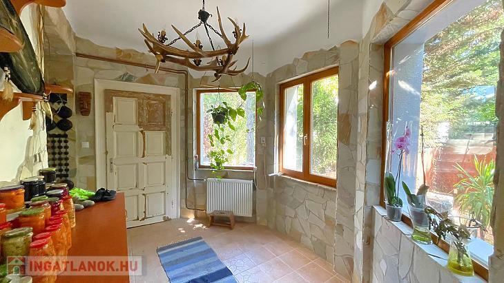 Étkezős konyhája jól szeparált, a hátsó kertre tekint és egy kisebb méretű kamrával is rendelkezik.