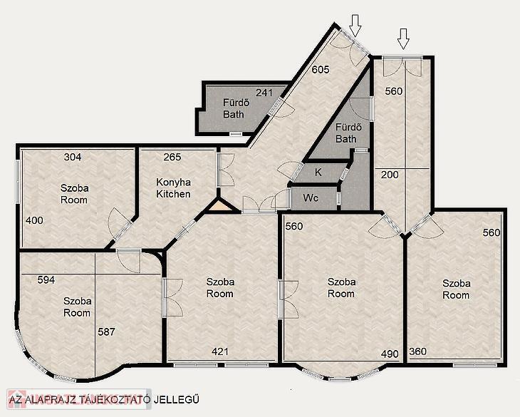 Szobái tágasak és nagy üvegfelületeiknek köszönhetően jó fényviszonyokkal rendelkeznek. Jelenlegi kialakításában 2 konyha és 2 fürdő kapott helyet. Az egyik fürdő zuhannyal és wc-vel, míg a másik káddal szerelt. Ezen felül egy külön wc is található a lakásban.