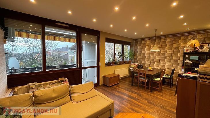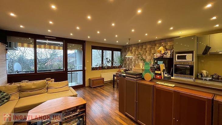 A lakás központi része a tágas, nagy üvegfelülettel rendelkező, dk-i fekvésű, erkélykapcsolatos, szép kilátással rendelkező amerikai konyhás nappali.