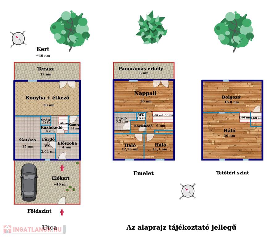 A ház négyes tagozódással rendelkezik, optimálisan szeparált, biztosítva ezzel a szükséges intimitást. A garázs, udvari beálló és saját elő- és hátsókert mind hozzájárulnak az otthon kényelméhez. A belső tágas két szintet további két szintre osztott tetőtér egészíti ki, így minden családtagnak kényelmes és privát teret biztosítva.