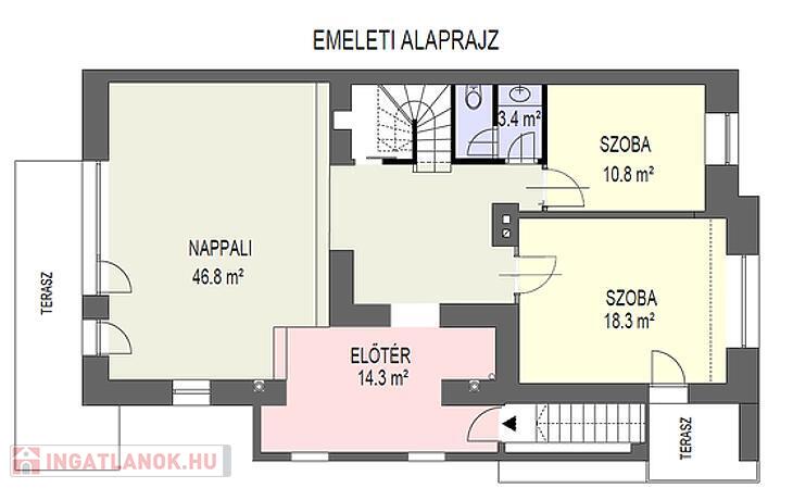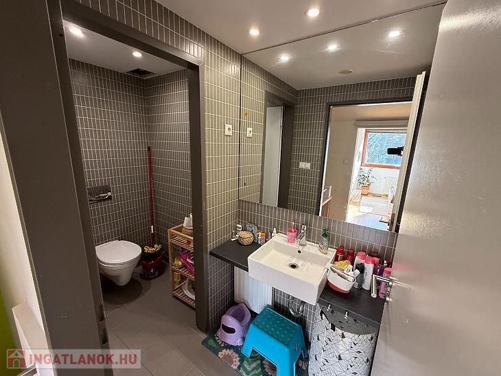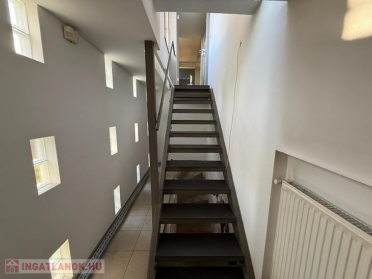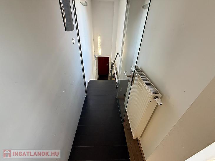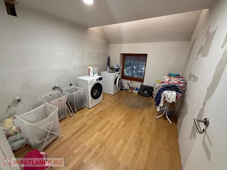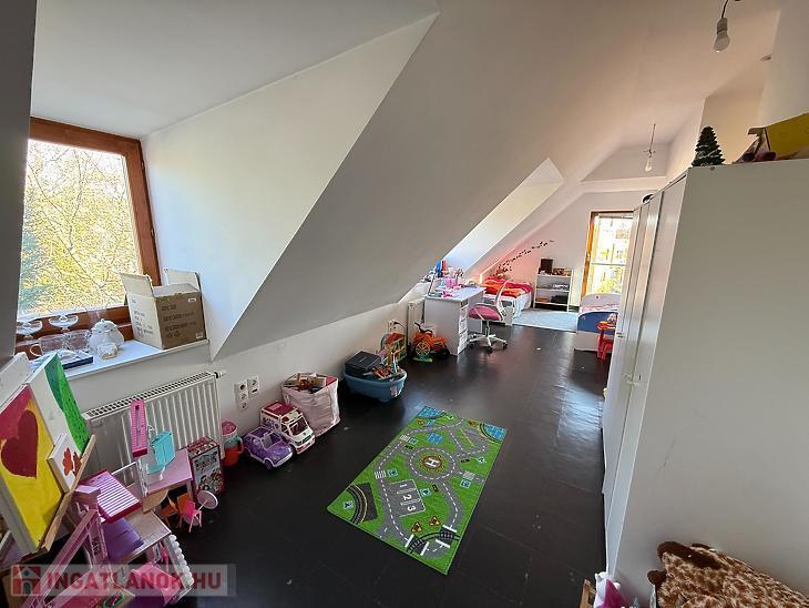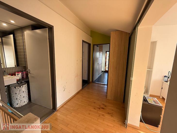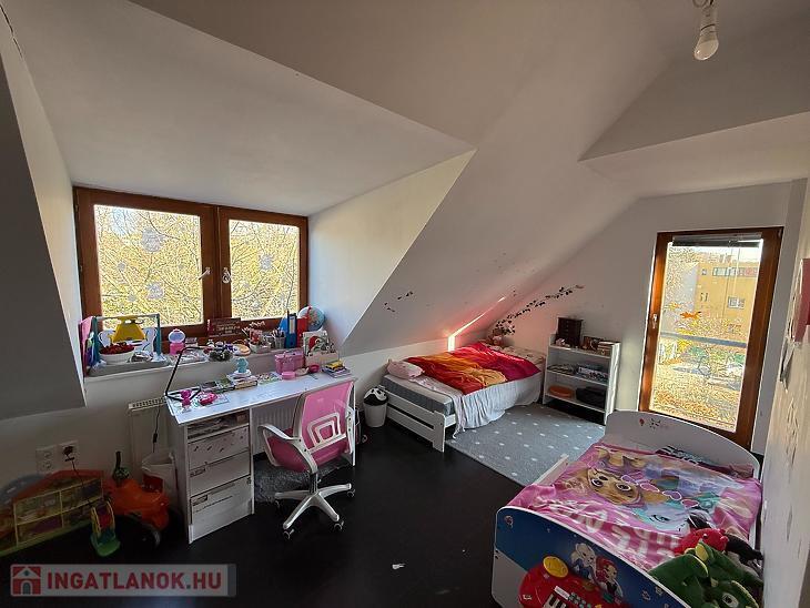 A szigetelt ház 2 lakásos, 3 szintes, amelyből az eladásra kínált lakás a felső két szinten helyezkedik el. A lakás 6 szobával rendelkezik, amelyből az első emeleten található egy nappali + 2 szoba, a többi szoba a második emeleten helyezkedik el.