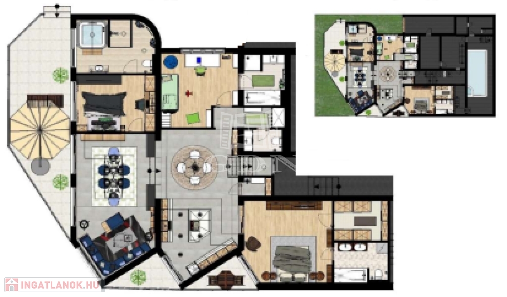 Fontos megemlíteni, hogy a kertkapcsolatos ingatlan hálószobai gardrób válaszfalának átalakításával akár közvetlen, privát kapcsolatot lehet biztosítani a wellness részhez!