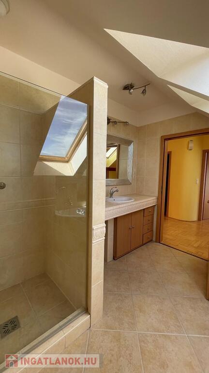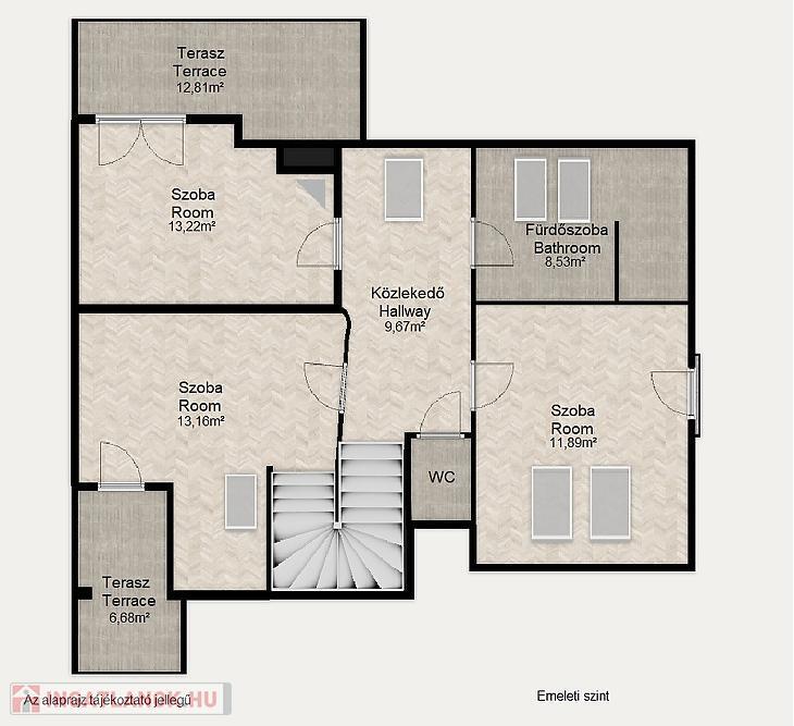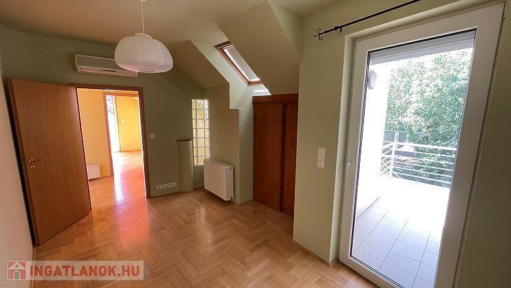 Az emeleti szinten 3 szeparált hálószoba, egy káddal és zuhanyzóval is felszerelt fürdőszoba, közlekedő, 2 terasz és egy franciaerkély lett kialakítva.