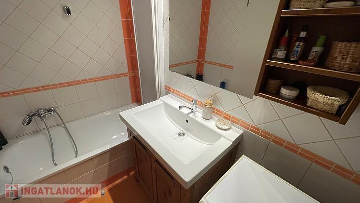 A káddal, mosdóval szerelt fürdőszoba az előszobából közelíthető meg. Itt került elhelyezésre a mosógép és a kazán is.