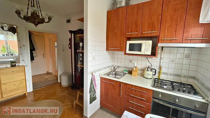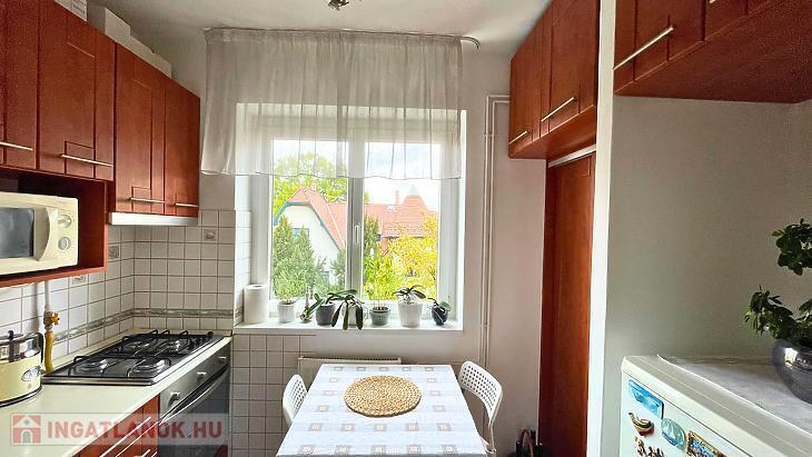 Konyhája rendkívül világos, könnyen szellőztethető és kamraszekrénnyel is rendelkezik.