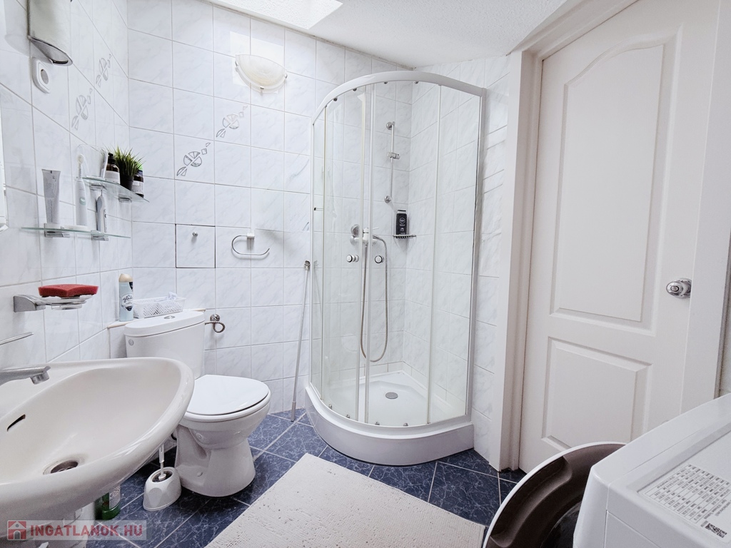 A fürdő ablakos, nagyon világos, zuhanyzóval, WC-vel, kézmosóval és mosógép kiállással.