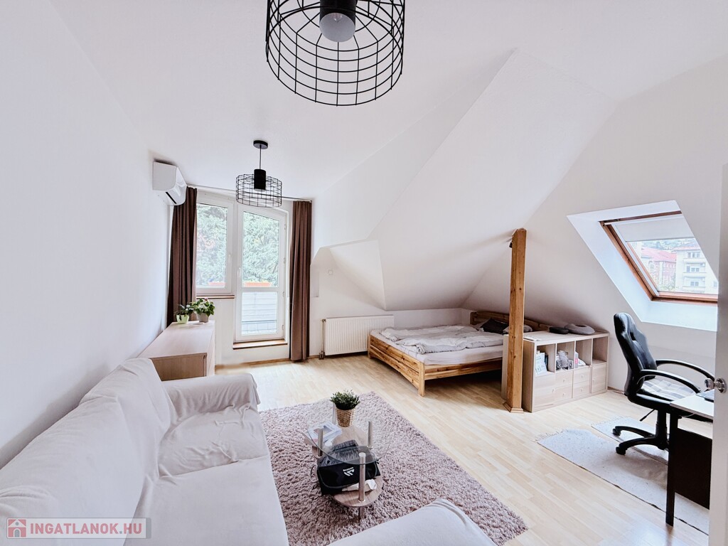 A szoba déli irányban erkélyajtóval és ablakkal, a nyugati irányba tetőtéri ablakkal rendelkezik, így egész nap napos, világos.