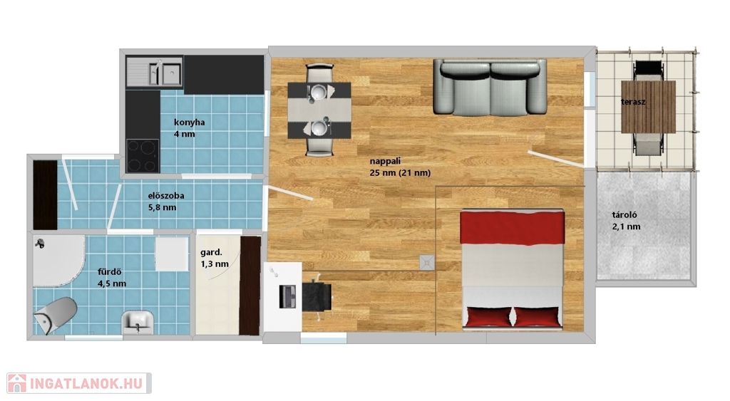 • Alapterület: bruttó 41 m² + 2,5 nm terasz