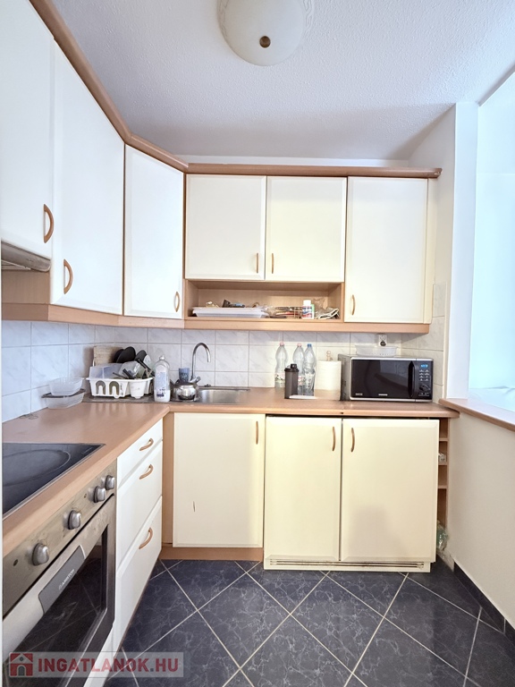 A konyha tágas, jó beosztású, praktikus átadóablakkal a szoba felé, ami igény esetén ablakkal lezárható.