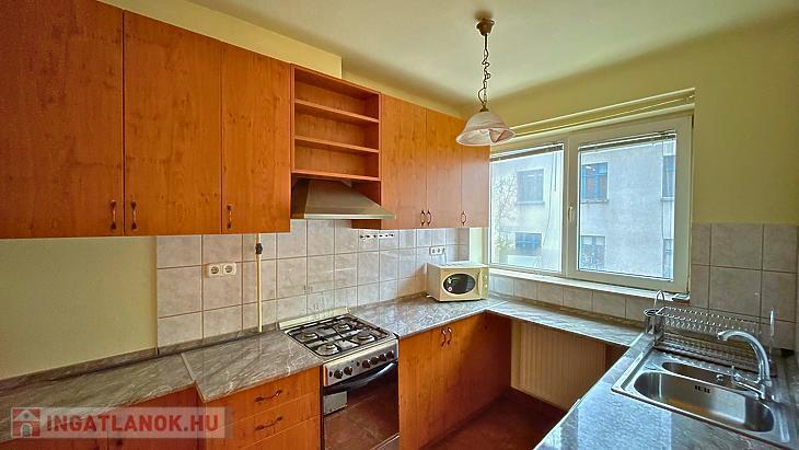 Konyhája világos, ideális méretű. Szomszédságában találjuk az ablakos, sarokkáddal szerelt fürdőszobát. A külön wc-t az előszobából közelíthetjük meg.