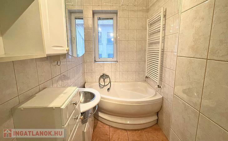 Konyhája világos, ideális méretű. Szomszédságában találjuk az ablakos, sarokkáddal szerelt fürdőszobát. A külön wc-t az előszobából közelíthetjük meg.