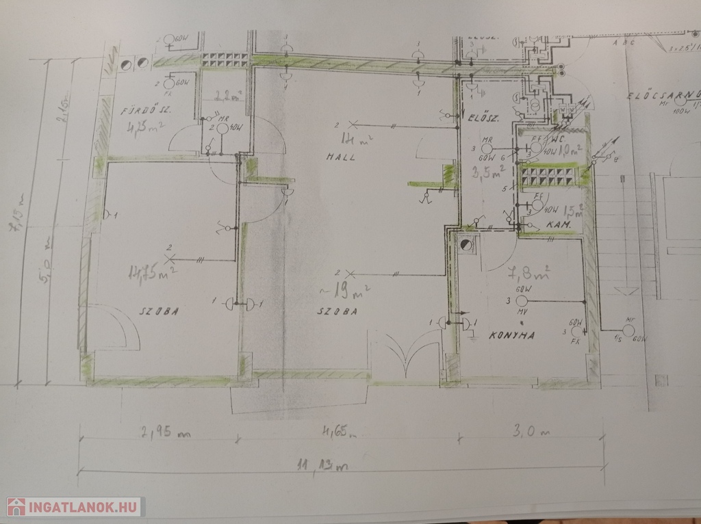 Helységek: 2 szoba + hall, fürdőszoba, gardrób, előszoba, külön WC, kamra, konyha