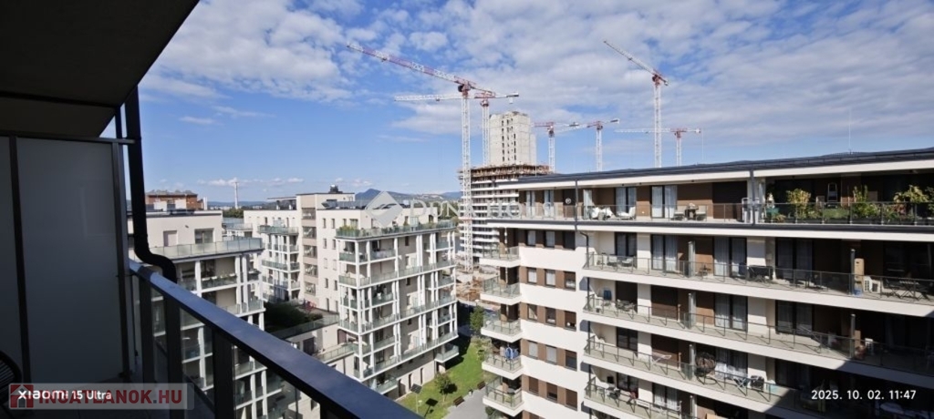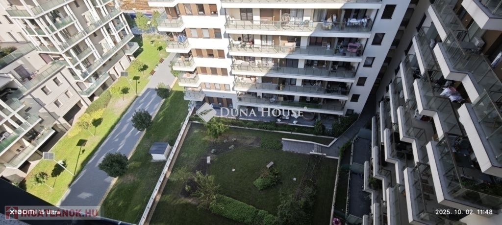 A lakás a 9. emeleten található, belső kertre néz, és panorámás kilátást kínál a Budai-hegyekre.