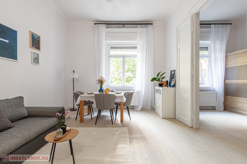 Újlipótváros szívében, a közkedvelt Gogol utcában kínálunk eladásra egy teljeskörűen, frissen felújított, 4 szobás (3 hálószoba + nappali), duplakomfortos, félemeleti nagypolgári lakást.
