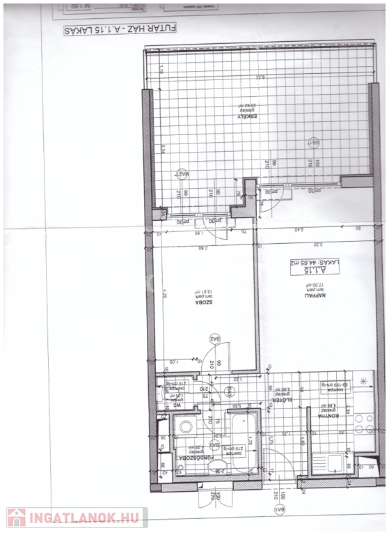 Tulajdoni lapon 45 m² lakótér (amerikai konyhás nappali és 2 háló) + 24 m² beépített erkély
