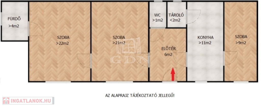 Ingatlan elosztása: szoba (22m2), szoba (21m2), szoba (9m2), konyha (11m2), kamra (2m2), fürdő (4m2), wc (1m2), előtér (6m2)
