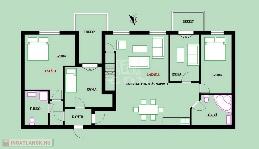 A fő bejárati ajtón belépve, egy kis előtérből jobbra nyílik a nagyobb 3 szobás ingatlan, balra a kisebb 2 szobás. Minden új a lakásban, még senki nem használta. A konyha kialakítása még az új tulajdonosra vár.