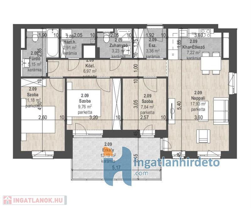 - fűtése: levegős hőszivattyús rendszer (padlófűtés, Fan-coil hűtés)