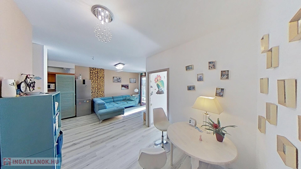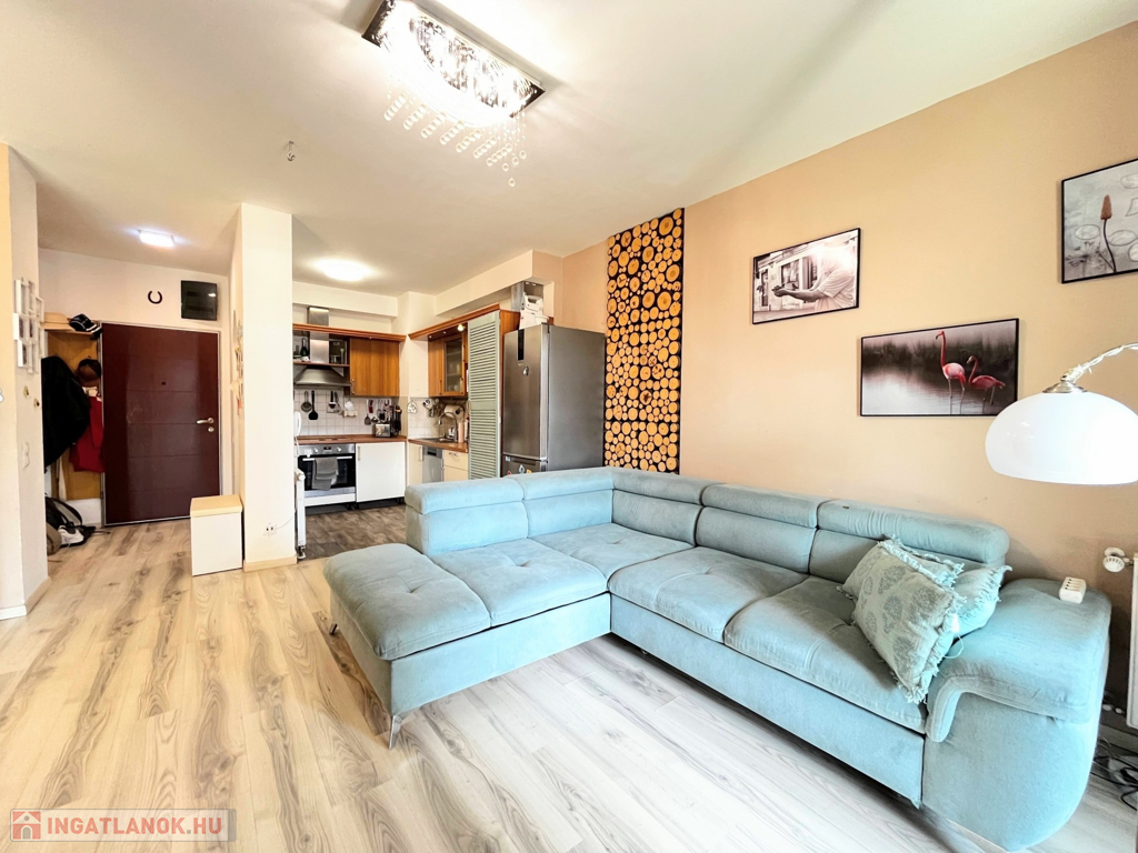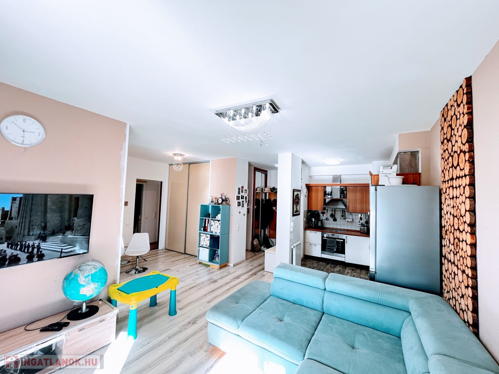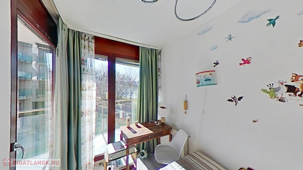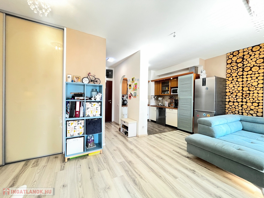 A lakásban a nagy, amerikai konyhás nappalin kívül két hálószoba várja az új tulajdonost. A kisebb háló utólag, a nappali területéből leválasztva lett kialakítva, így lehetőség van annak visszabontására, amivel a nappali még impozánsabb, világosabb lesz.