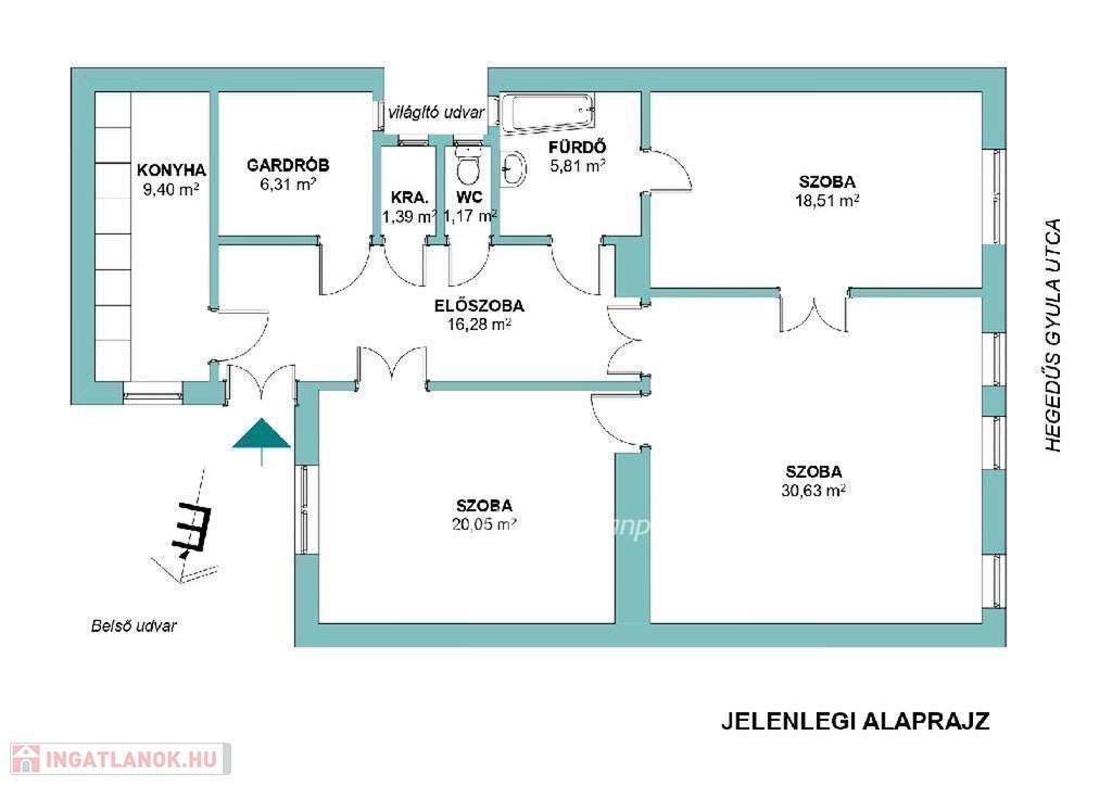 TÁGAS előszoba, fürdőszoba, KÜLÖN wc, gardrób szoba, kamra, és konyha található, klasszikus, a POLGÁRI lakásokra jellemző elrendezésben.