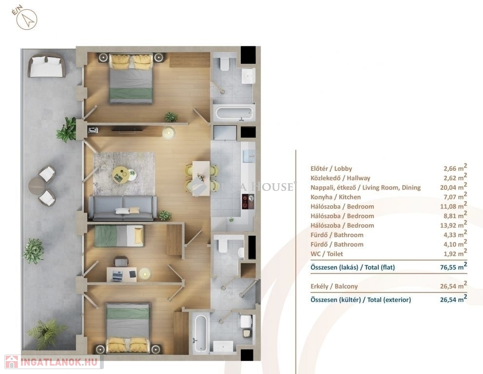 Eladó a 13. kerületben a Marina Parton, egy 77 m2 +27m2-es, 5. emeleti, 4 szobás, Ny-i tájolású, csendes sétányra néző, napfényes lakás.A lakás magas építési minőséggel készült, az energetikailag korszerű mennyezeti-hűtés fűtés kellemes hőérzetet biztosít majd.A lakóparkban kétszintes mélygarázs épült, melyben e-töltővel előkészített parkolóhelyek és tárolók kerültek kialakításra.A társasházban: Recepció szintű portaszolgálat, és csomagpont található.A közösségi életről pedig a közösségi tetőteraszok (jóga + napozó és grillterasz) a játszóterek és a lakók számára használható sporteszközök gondoskodnak.A környék:Képzeld el, hogy a nap végén a lenyűgöző Duna-parton ülve nézed naplementét! A helyszín garantálja, hogy mindennapjaid része lesz a folyó, a sétány és a kikötő.Pár lépésre a Duna part, de számtalan szórakozási és sportolási lehetőséget talál ebben az exkluzív környezetben: Marina sétányon játszóterek, kültéri edzőterem, teniszpálya igényes éttermek, kávézók, élelmiszerbolt, jacht kikötők, kondi termek, medencék, futó pálya.Frekventáltságát tekintve 5 percre a 3-as metró, buszok, kerékpárút szinte a ház előtt, a kikötő kb. 100 méter, így akár autóval, biciklivel, metróval vagy akár hajóval is elérheti a belvárost.Befektetés:A Duna-parti lakások igen kedveltek a befektetők körében, nem ok nélkül. A korlátozottan rendelkezésre álló, Duna menti telkeken épült ingatlanok azon felül, hogy értékállóak minden évben jelentősen növekszik az értékük, illetve gyorsan és egyszerűen bérbe lehet adni, így akár kiemelkedő hozamot biztosítanak tulajdonosaiknak.Ha Ön családjával egy nyugodt, biztonságos, tiszta levegőjű, kényelmes otthont keres, vagy akár egy jó befektetés.